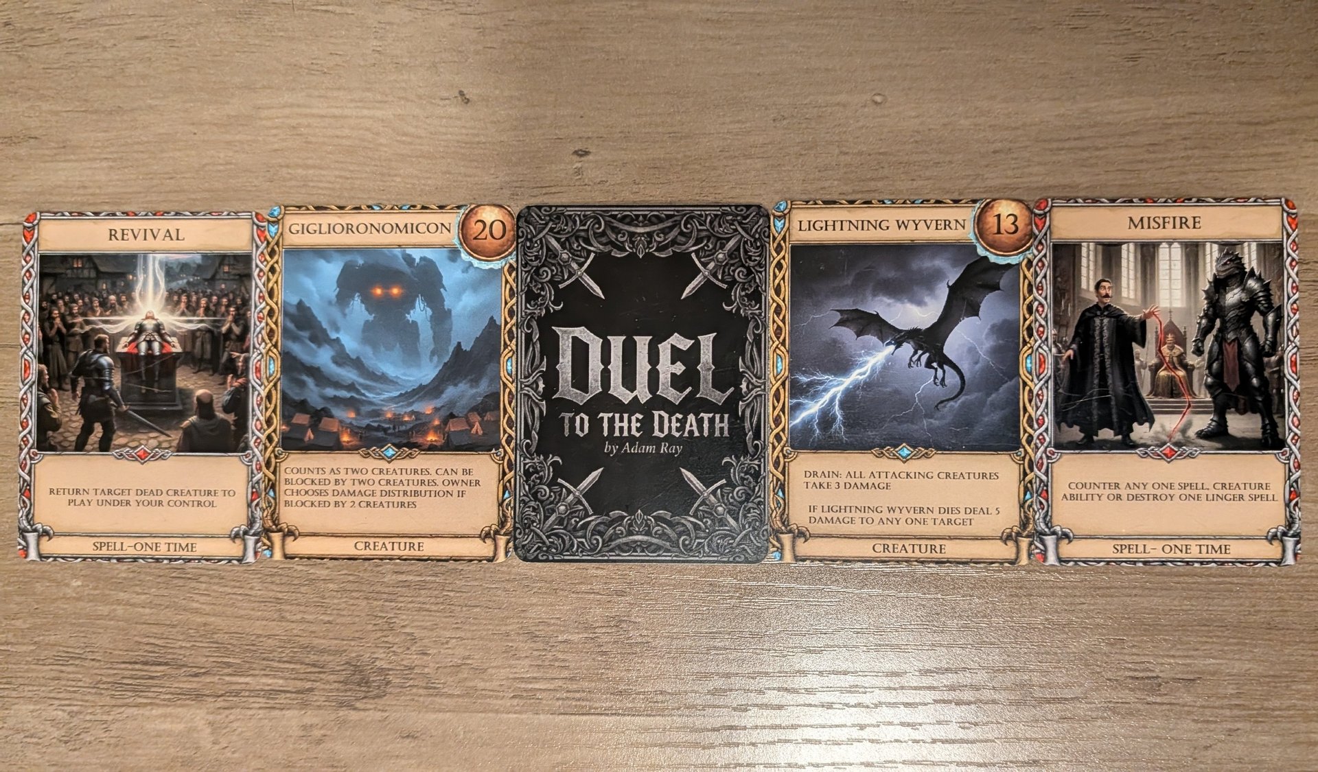 When two creatures are battling compare their power numbers, found in the top right of each card. The one with the higher power lives through the battle and the creature with the lower number dies and is put in the discard pile next to the deck. If the power numbers are even neither creature dies. If a spell or creature ability would do damage to a creature during battle it effectively decreases the damaged creature's power number by the amount of damage done. Example-an attacking creature has 10 power, if it takes 8 damage, its power is now 2 until the end of the turn. If the same creature were to damage a player that player would lose 2 life points. At the end of each player's turn, all creature's power numbers return to their original values